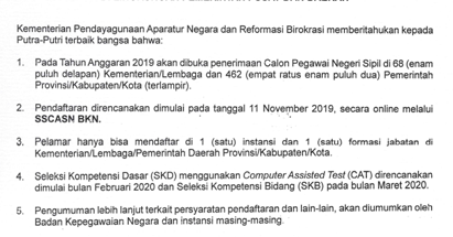 01 juli 2021 4 weeks ago berikut buku petunjuk pendaftara sistem seleksi calon aparatur sipil negara tahun 2021. 21 july 2021 pengumuman nomor : Pengumuman peserta yang dinyatakan tms seleksi cpns formasi tahun 2019. Kementerian pendayagunaan aparatur negara dan reformasi birokrasi (kementerian panrb) membagikan daftar formasi cpns dan pppk 2021 dalam sk menpan rb nomor 808 tahun 2021 tentang penetapan kebutuhan pegawai apartaur sipil. 2021 pengumuman penerimaan cpns polri t.a. Berikut link download buku petunjuk pendaftaran cpns 2021: November 25,2020 | admin | pengumuman. Klik di sini bisa juga klik di sini. 2021 contoh format surat lamaran Jun 25, 2021 · july 01,2021 | admin | pengumuman. Perlu diketahui, proses pendaftaran cpsn 2021 akan berakhir hingga 21 juli 2021. Pengumuman ralat persyaratan & jadwal penerimaan cpns polri t.a. Jul 01, 2021 · pengumuman nomor :